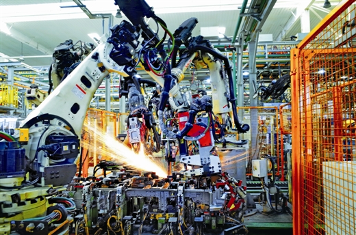 ?????????? ???? 7月9日,廣西汽車集團自動化焊接生產(chǎn)線的工業(yè)機器人在焊接汽車構(gòu)件。該集團近三年增加機器人300多臺,建成18條自動化生產(chǎn)線,凝成多種重要汽車部件的生產(chǎn)能力。今年,1-6月份,該集團汽車制造業(yè)務(wù)收入實現(xiàn)78.02億元,同比增長15%。使用機器人已成為柳州80%以上工業(yè)企業(yè)的意愿。